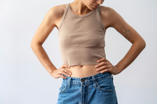 - Start fra buksebenene og rul stramt op mod linningen.